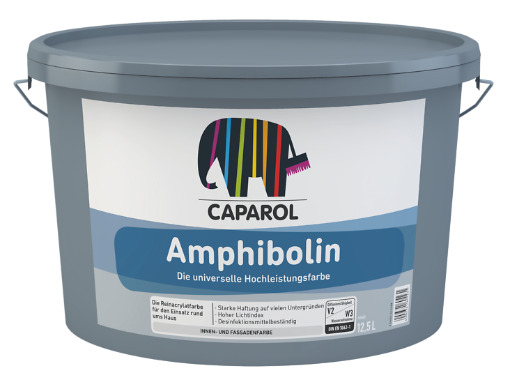 Amphibolin is een veelzijdig toe te passen muurverf voor buiten, maar is zeker ook voor binnentoepassingen geschikt. De verf hecht goed op bijna iedere ondergrond. Amphibolin is toe te passen op minerale pleisterlagen, beton, kalkzandsteen, metselwerk van baksteen, vezelcementplaten, draagkrachtige oude afwerklagen, verzinkte oppervlakken, hard-PVC, niet-maatvast hout. Dit product is een verf voor gladde en fijn gestructureerde oppervlakken. Caparol Amphibolin heeft een zeer goed reflectievermogen waardoor in een minder goed verlichte ruimte de lichtopbrengst 20% hoger ligt dan bij een vergelijkbaar product.