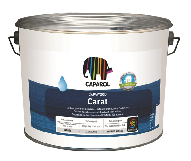 CapaWood Carat is een zelfreinigende, met water te verdunnen, hybride houtverf voor toepassing buiten welke is gebaseerd op een speciaal gemodificeerde alkydemulsie en acrylaat. In combinatie met het Caparol Clean Concept zorgt dit voor unieke eigenschappen. CapaWood Carat dringt goed in het hout en geeft een robuust en weerbestendig oppervlak. Op onbehandeld hout volstaat een tweelaags verfsysteem. De hoge droge laagdikte zorgt voor een goede dekking en een zeer goede kantendekking. CapaWood Carat is speciaal ontwikkeld voor houtwerk zoals rabat en stapelbouw en is tevens bijzonder geschikt voor het dekkend behandelen van onderzijdes van carports en (terras-)overkappingen.