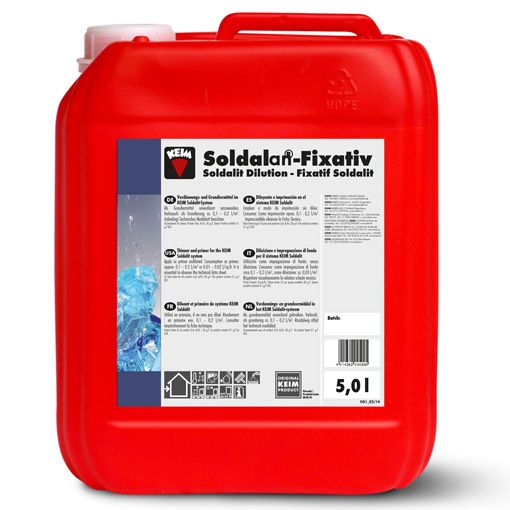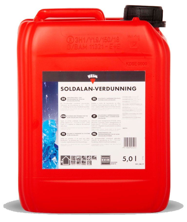 KEIM Soldalan-Verdunning dient als verdunning voor KEIM Soldalan en KEIM Soldalan- Grof. Bij het toepassen van KEIM Contact-Plus als grondlaag onder het KEIM Soldalan systeem, dient KEIM Contact-Plus met KEIM Soldalan-Verdunning verdund te worden. Tevens kan KEIM Soldalan-Verdunning als grondering gebruikt worden op sterk zuigende ondergronden.